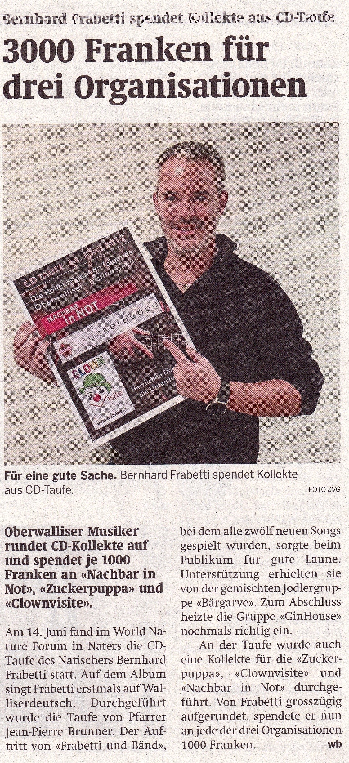 Musiker Bernhard Frabetti spendet aus dem Erlös seiner CD-Taufe Fr 1'000